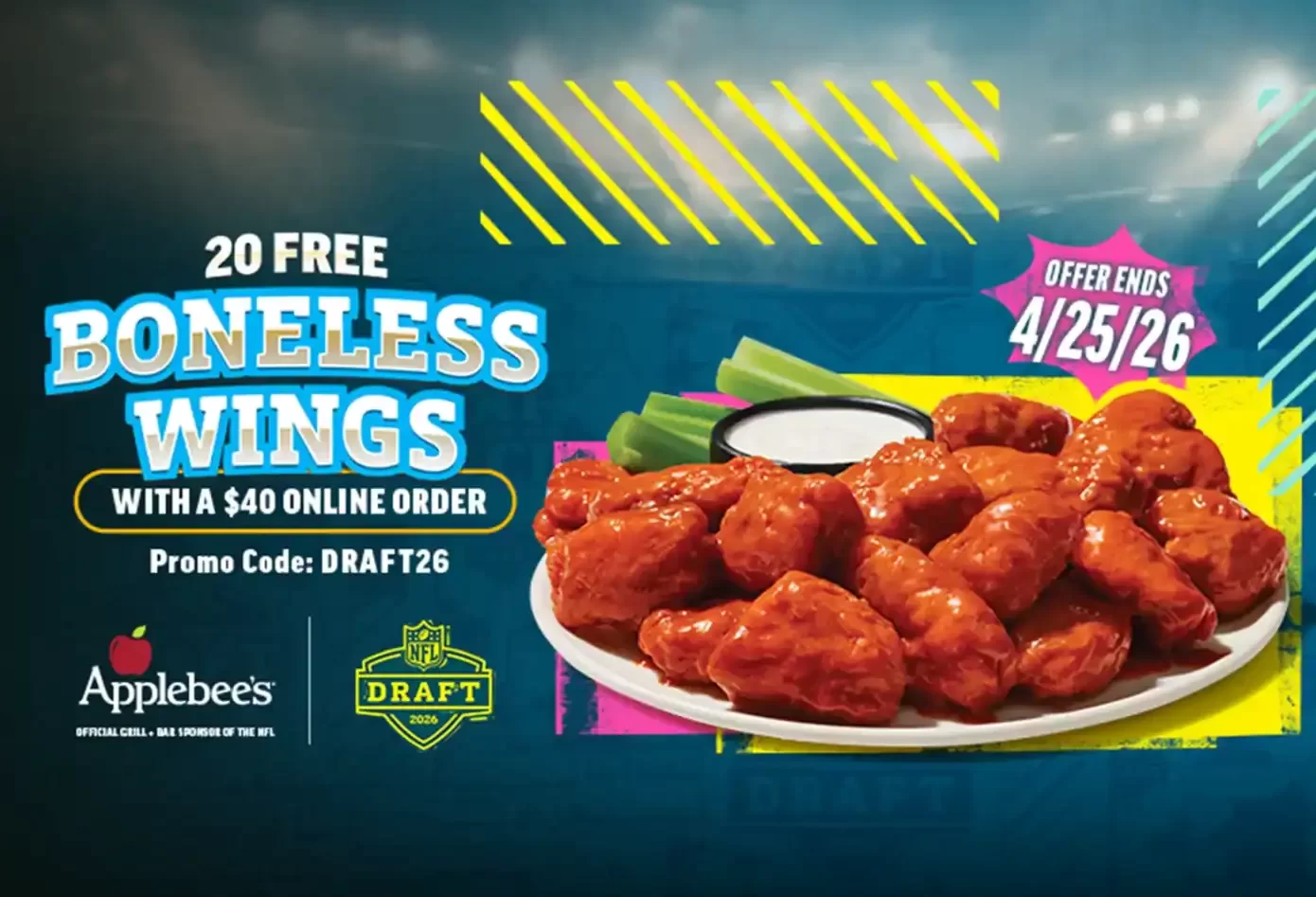 As the Official Grill + Bar Sponsor of the NFL, Applebee’s is offering 20 FREE Boneless Wings with a $40 online order at participating locations — from April 23 to 25, 2026. Use promo code DRAFT26 at checkout.